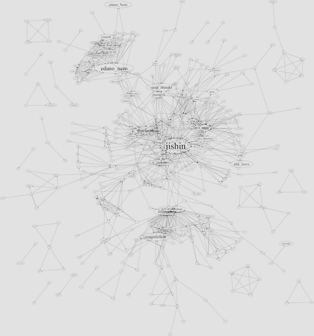 03-11 09 10 11 12 13 14 15 16 17 18 19 20 21 22 23 03-12 00 01 02 03 04 05 06 07 08 09 10 11 12 13 14 15 16 17 18 19 20 21 22 23 03-13 00 01 02 03 04 05 06 07 08 09 10 11 12 13 14 15 16 17 18 19 20 21 22 23 03-14 00 01 02 03 04 05 06 07 08 09 10 11 12 13 14 15 16 17 18 19 20 21 22 23 03-15 00 01 02 03 04 05 06 07 08 09 10 11 12 13 14 15 16 17 18 19 20 21 22 23 03-16 00 01 02 03 04 05 06 07 08 09 10 11 12 13 14 15 16 17 18 19 20 21 22 23 03-17 00 01 02 03 04 05 06 07 08 09 10 11 12 13 14 15 16 17 18 19 20 21 22 23 03-18 00 01 02 03 04 05 06 07 08 | Top > Project 311 > 2011-03-15_132011-03-15_13のハッシュタグの共起ネットワーク*各画像は縮小後の物で、元のサイズの画像にリンクされています。全体UCINET用ネットワークファイルGraphviz用ネットワークファイル ![]() リツイートなしUCINET用ネットワークファイルGraphviz用ネットワークファイル ![]() リツイートのみUCINET用ネットワークファイルGraphviz用ネットワークファイル ![]() |