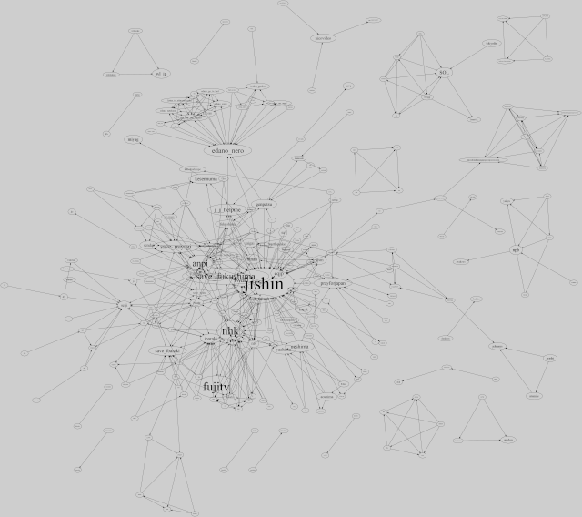 03-11 09 10 11 12 13 14 15 16 17 18 19 20 21 22 23 03-12 00 01 02 03 04 05 06 07 08 09 10 11 12 13 14 15 16 17 18 19 20 21 22 23 03-13 00 01 02 03 04 05 06 07 08 09 10 11 12 13 14 15 16 17 18 19 20 21 22 23 03-14 00 01 02 03 04 05 06 07 08 09 10 11 12 13 14 15 16 17 18 19 20 21 22 23 03-15 00 01 02 03 04 05 06 07 08 09 10 11 12 13 14 15 16 17 18 19 20 21 22 23 03-16 00 01 02 03 04 05 06 07 08 09 10 11 12 13 14 15 16 17 18 19 20 21 22 23 03-17 00 01 02 03 04 05 06 07 08 09 10 11 12 13 14 15 16 17 18 19 20 21 22 23 03-18 00 01 02 03 04 05 06 07 08 | Top > Project 311 > 2011-03-16_232011-03-16_23のハッシュタグの共起ネットワーク*各画像は縮小後の物で、元のサイズの画像にリンクされています。全体UCINET用ネットワークファイルGraphviz用ネットワークファイル ![]() リツイートなしUCINET用ネットワークファイルGraphviz用ネットワークファイル ![]() リツイートのみUCINET用ネットワークファイルGraphviz用ネットワークファイル ![]() |